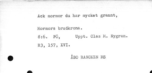 //// :* //// Ack mormor du har mycket grannt, //// Mormors brudkrona. //// * - //// 6:6. PÖ, Uppt. Clas M. Nygren. //// R3, 157, XVI. //// ^ ÅBO RANCKEN MS ////