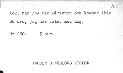 //// K V ! ^ ri //// Ack, när jag mig påminner och kommer ihåg //// De ord, jag har talat med dig^ //// Nr 260. 5 str. //// AUGUST BONDESONS VISBOK ////