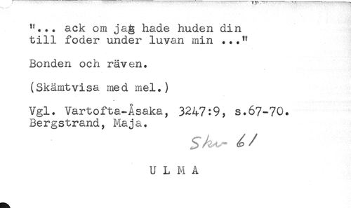 //// "... ack om jag hade huden din //// till foder under luvan min ..." //// Bonden och räven. //// (Skämtvisa med mel.) //// Vgl. Vartofta-Asaka, 3247:9, s.67-70. //// Bergstrand, Naja. ////