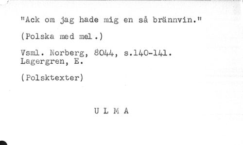 //// "Ack om jag hade mig en så brännvin." //// (Polska med mel .) //// Vsml. Norberg, 8044, s.140-141. //// Lagergren, E. //// (Polsktexter) //// U L M A ////