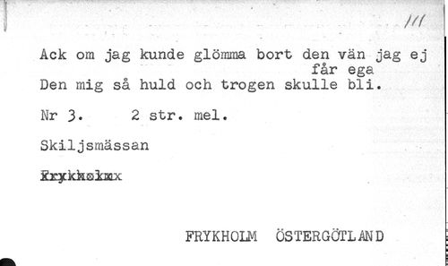 //// ^ ' - . - .. . ' . . //// * //// Ack om jag kunde glömma bort den vän jag ej //// får ega //// Den mig så huld och trogen skulle bli. //// Nr 3* 2 str. mel. //// Skiljsmässan //// Xxykk^imx //// FRYKHOLM ÖSTERGÖTLAND ////