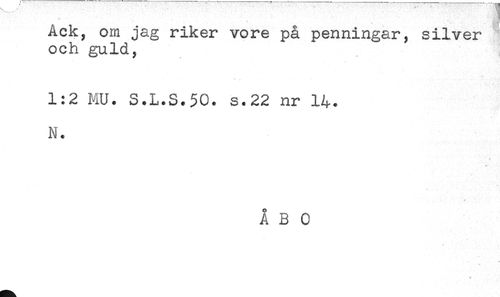 //// ACK, om jag riker vore pa penningar, silver //// och guld, //// 1:2 MU. S.L.S.50. s.22 nr 14. //// N. //// ÅBO ////