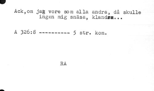 //// Ack,om vore som alla andra, då skulle //// ingen mig snäsa, klandaa... //// A 326:8-----5 str. kom. //// RA ////