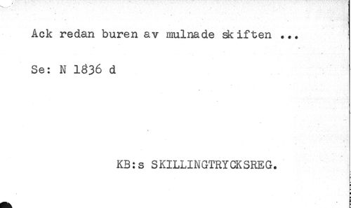 //// Ack redan buren av mulnade skiften ... //// * //// . //// Se: N 1336 d //// . * //// KB:s SKILLINGTRYCKSREG. //// t ////