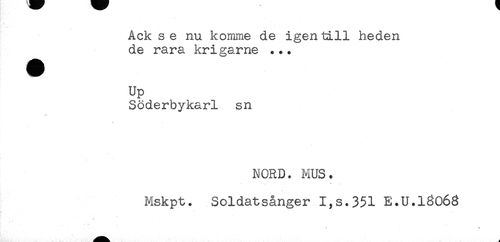 //// Ack s e nu komme de igen till heden //// de rara krigarne ... //// Up //// Söderbykarl sn //// NORD. MUS. //// Mskpt. Soldatsånger I,s.351 E.U.1M3 ////
