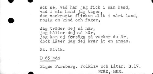 //// RCK se, vau nar jag i^cK i n^na, //// vad i min hand jag tager, //// den vackraste flickan allt i vårt land, //// ^^ rosig om kind och fager, //// Jag träder dej så när, //// jag håller dej så kär, //// jag kan ej fi?rsäg§. så vacker du är, //// dock