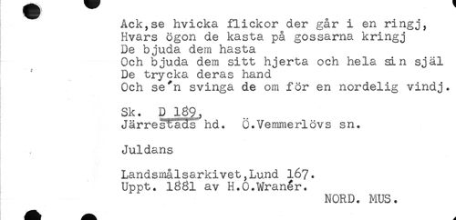 //// Ack,se hvicka ilickor der gar i en ringj, //// Hvars ögon de kasta på gossarna kringj //// De bjuda dem hasta //// Och bjuda dem sitt hjerta och hela sin själ //// De trycka deras hand //// Och se^n svinga de om för en nordelig vindj. //// Sk. D 189,