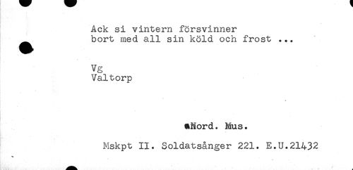 //// 6, . t'. . //// Ack si vintern försvinner //// ^^ bort med all sin köld och frost ... //// < * //// Vg //// Valtorp //// k //// tNord. Mus. //// Mskpt II. Soldatsånger 221. E.U.21432 ////