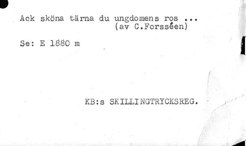 //// Ack sköna tårna du ungdomens ros ... //// (av C.Forsséen) //// Se: E lg^O m jt //// / //// KB:s SKILLINGTRYCKSREG. //// ^^ - //// / < //// /' - ^ ////