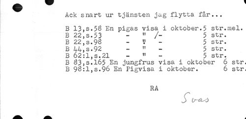 //// Ack snart ur tjänsten jag flytta får... //// * * //// B 13,s.58 En pigas visa i oktober.5 str.mel. //// B 22,s.53 - " /- 5 str. //// B 22,s.98 - U - 5 str. //// B 44,s.92 - " - 5 str. //// B 62:1,s.21 - " - 5 str. //// B 83,s.16$ En jungfrus visa i o
