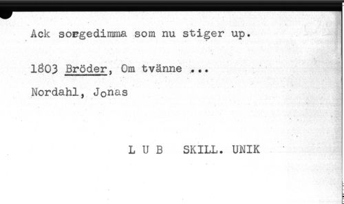 //// * //// Ack so&gedimma som nu stiger up. //// * //// * //// 1303 Bröder, Om tvänne ... //// < //// Nordahl, Jonas //// . //// L U B SKILL. UNIK //// t //// - //// s ////