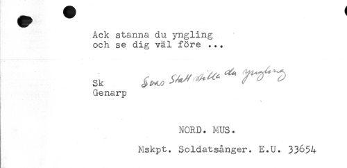 //// Ack stanna du yngling //// och se dig väl före ... //// * //// Sk //// Genarp //// NORD. MUS. //// Mskpt. Soldatsånger. E.U. 33654 ////