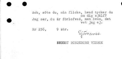 //// ! Ack, söta du, min flicka, hvad tycker du //// om dig själf? //// ^^ Jag ser, du är förlofvad, men hvem, det //// ^ . vet jag ej. //// Nr 256, 9 str. //// - //// BSGGST BONDESONS VISBOK //// * ////