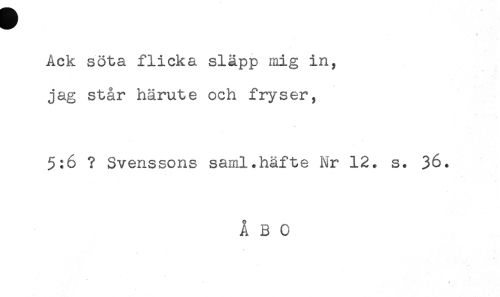 //// Ack söta flicka släpp mig in, //// jag står härute och fryser, //// 5:6 ? Svenssons saml.häfte Nr 12. s. 36. //// ÅBO //// < ////