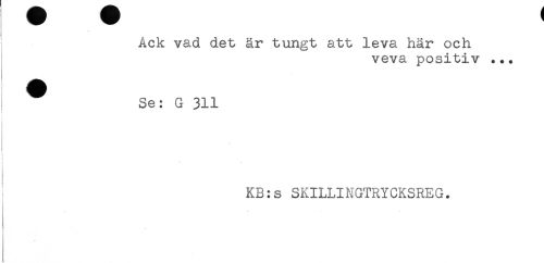 //// Ack vad det är tungt att leva här och //// veva positiv ... //// i ^ Se: G 311 //// * //// KB:s SKILLINGTRYCKSREG. //// < ////