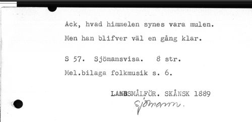 //// ! //// : //// { * - ... //// t //// Ack, hvad himmelen synes vara mulen. //// i //// Men han blifver väl en gång klar. //// S $7. Sjömansvisa. g str. //// Mel.bilaga folkmusik s. 6. //// LANBSMÅLFÖR. SKÅNSK 1339 ////