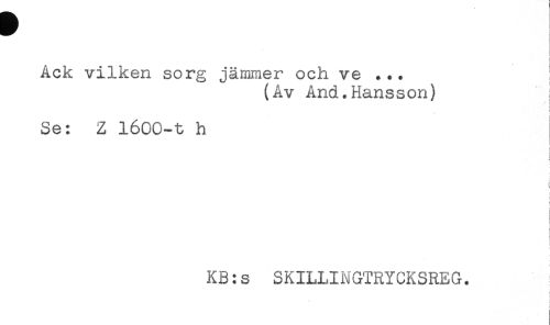 //// Ack vilken sorg jämmer och ve ... ! //// (Av And.Hansson) //// t //// < //// i //// i //// Se: Z 1600-t b //// t //// t //// i //// ; //// < //// i //// t //// KB:s SKILLINGTRYCKSREG. //// i //// s //// ) ////