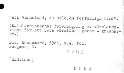 //// t //// "Ack Värmeland, du usla,du förfärliga land". //// (Dalslänningarnas förvrängning av värmlands- //// visan för att reta värmlänningarna - grannar- //// na. ) //// Dis. Nössemark, 59^4, s.4. fol. //// Bergman, G. //// (Nidvisor) //// . s //// U L M Å ! //// I ////
