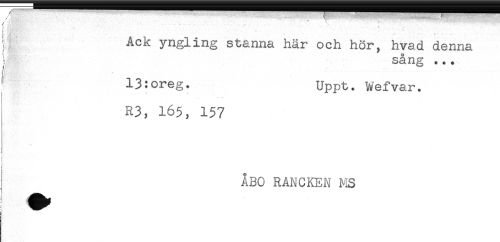 //// / '- . . . //// i . //// ): ' " . . //// ^ Ack yngling stanna här och hör, hvad denna //// i sång ,.. //// ^ 13:oreg. Uppt. Wefvar. //// R3, 165, 157 //// r //// * //// ÅBO RANCKEN MS //// ^ HM ////