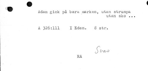 //// ^^ Adam gick på bara marken, utan strumpa //// utan sko ... //// * //// A 326:111 I Eden. 8 str. //// < //// RA //// * ////