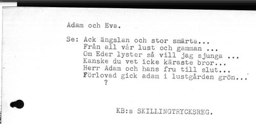 //// Adam och Eva. //// Se: Ack ängslan och stor smärta... //// Från all vår lust och gamman ... //// Om Eder lyster så vill jag sjunga ... //// Kanske du vet icke käraste bror/.. //// Herr Adam och hans fru till slut... //// Förlovad gick adam i lustgården grön... //// * //// t //// , KB:s SKILLINGTRYCKSREG. ////