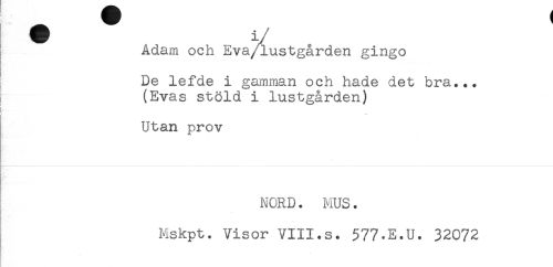 //// Adam och Eva/lustgården gingo //// K //// De lefde i gamman och hade det bra... //// (Evas stöld i lustgården) //// ! //// Utan prov //// NORD. MUS. //// Mskpt. Visor VIII.s. 577-E.U. 32072 //// r ////
