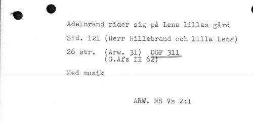 //// Adelbrand rider sig på Lena lillas gård //// Sid. 121 (Herr Hillebrand och lilla Lena) //// 26 str. (Arw. 31) DGF 311 //// (G.Afz II 62r //// Med musik //// ARW. MS Vs 2:1 ////