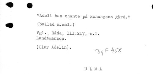 //// "Adeli han tjänte på konungens gård." //// ^^ (ballad m.mel.) //// t //// Vgl., Råda, 111:217, s.l. //// Landtmanson. //// (Olar Adelin). , ,^ //// U L M A ////