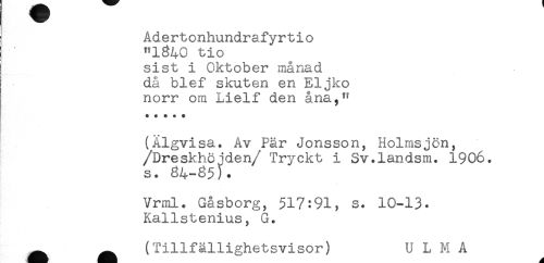 //// j Adertonhundrafyrtio //// ! tio //// sist i Oktober månad //// då blef skuten en Eljko //// norr om Lielf den åna," //// (Älgvisa. Av Pär Jonsson, Holmsjön, //// /Breskhöjden/ Tryckt i Sv.landsm. 1906. //// s. 34-35}. //// Vrml. Gåsborg, 517:91, s. 10-13- //// Kallstenius, G. //// — ^ (Tillfällighetsvisor) U L M A //// 1) t 1 t i ////