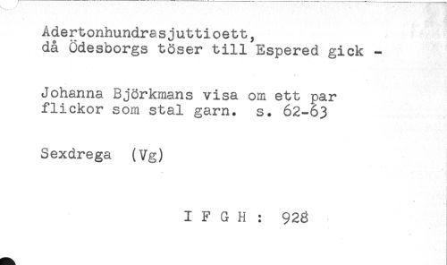 //// Adertonhundras jutti oett, //// då Odesborgs töser till Espered gick - //// Johanna Björkmans visa om ett par //// flickor som stal garn. s. 62-63 //// Sexdrega (Vg) //// - //// I F G H : 92g //// - ////