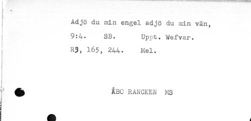 //// - . . ^ //// Adjö du min engel adjö du min vän, //// 9:4- SB. Uppt. Wefvar. //// R3, 165, 244. Mel. //// i //// ! //// i //// '' A ÅBO RANCKEN MS //// ! ^^ ^ ////
