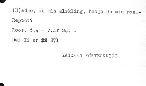 //// (H)adjö, du min älskling, hadjö du min ros.- //// Reptot? //// Roos. 6.4 - v.af 24. - //// Del Ii nr XÉ 871 //// RANCKEN FÖRTECKNING //// * ////