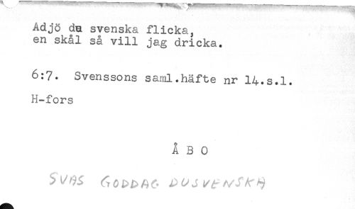 //// Adjö da svenska flicka, //// en skål så vill jag dricka. //// 6:7. Svenssons saml.häfte nr l^.s.l. //// H-fors //// ÅBO ////