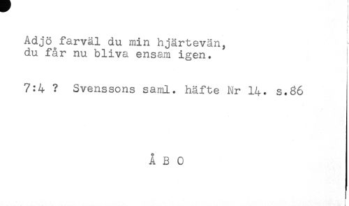 //// t //// Adjö farväl du min hjärtevän, //// du får nu bliva ensam igen. //// 7:4 ? Svenssons saml. häfte Nr 14. s.36 ////
