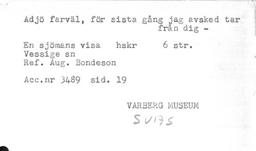 //// Adjö farväl, för sista gång jag avsked tar //// från dig - //// En sjömans visa hskr 6 str. //// Vessige sn //// Ref. Aug. Bondeson //// Acc.nr 34^9 sid. 19 //// //// //// //VARBERG MUSEUM //// 5 L//^ ////