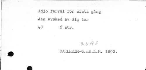 //// I Adjö farväl för sista gång //// Jag avsked av dig tar //// t //// i 48 6 str. //// ! //// t //// ^ ..... //// 1 ^ CARLHEIM-G.mS.L.M. 1892. //// i //// ! ^^ ////
