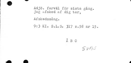 //// j Adjö. farväl för sista gång. //// j jag afsked af dig tar, //// Afskedssång. //// 9:3 Kl. S.L.S. 317 s.56 nr 1$. //// ÅBO ////