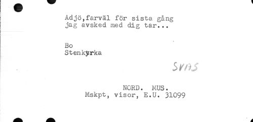 //// Adjö,farväl för sista gång //// jag avsked med dig tar... //// < //// i //// i //// Bo //// Stenkyrka //// NORD. MUS. //// Mskpt, visor, E.U. 31099 ////