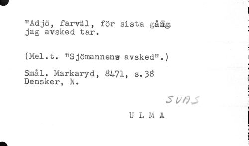 //// "Adjö, farväl, för sista gåå# ! //// jag avsked tar. //// H //// (Mel.t. "Sjömannen-s avsked".) //// ä //// Smål. Markaryd, 6471, s.36 ! //// Densker, N. [ //// H //// E //// a //// U L M A //// H //// H //// g //// g //// E ////