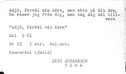 //// Adjö, farväl min kära, men akta på din ära, //// Nu reser jag från dig, men tag dig väl till- //// vara //// "Adjö, farväl min kära" //// Akl 3 61 //// Nr 23 5 str. Mel.not. //// Hammerdal (Jmtld) h //// t //// t //// LEVI JOHANSSON //// U L M A t //// a //// j //// 6= ////