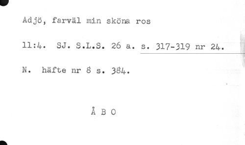 //// Adjö, farväl min sköna ros //// 11:4. SJ. S.L.S. 26 a. s. 317-319 nr 24. //// N. häfte nr 8 s. 384. //// * //// ÅBO ////