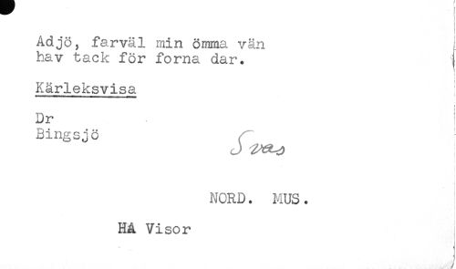 //// Adjö, farväl min ömma vän //// hav tack för forna dar. { //// t //// Kärleksvisa //// < //// Dr ^ //// Bingsjö //// /J ' - //// i //// i //// NORD. MUS. //// t //// t //// i //// Hå Visor //// //// /