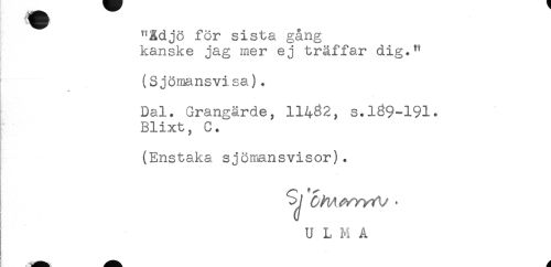 //// "Xdjö för sista gång //// kanske jag mer ej träffar dig." //// t? //// (Sjömansvisa). //// * //// Dal. Grangärde, 114Ö2, s.189-191. //// Blixt, C. //// (Enstaka sjöinansvisor) . //// U L M A ////