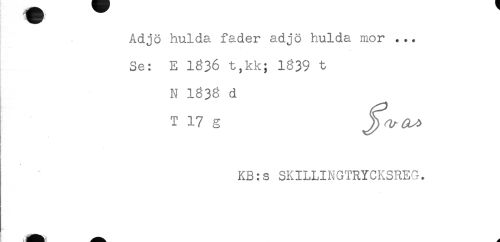 //// Adjö hulda fader adjö hulda mor ... //// Se: E 1836 t,kk; 1339 t //// N 1638 d //// T 17 g //// KB:s SKILLINGTRYCKSREG. ////