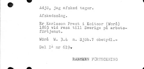 //// ! Adjö, jag afsked tager. //// ! //// ! Afskedssång. //// Er Karlsson Prest i Koitsor (Worå) //// 1863 vid resa till Sverige på arbets- //// ! förtjenst. //// Wörå W. 3.4 n. Sjöb.? obetydl.- //// Del nr 619-^ //// _ //// RAN6KEN FÖRTECKNING //// * ////