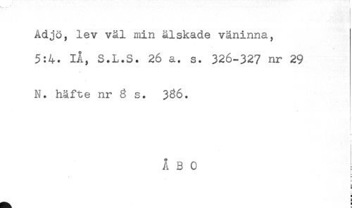 //// - //// Adjö, lev väl min älskade väninna, //// 5:4. IÅ, S.L.S. 26 a. s. 326-327 nr 29 //// N. häfte nr 8 s. 386. //// ! //// ! //// < //// ! //// ÅBO //// L //// * //// H //// B ////