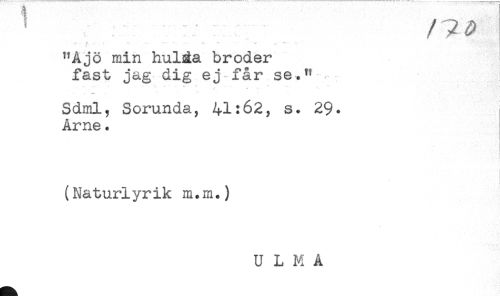 //// / ^ ^ //// -- r - * - * """ - ' ^ ' *' //// "A jo min hulÉa broder //// fast jag dig ej får se.^ //// _ . .. - ^ . - , //// * * t* //// Sdml, Sorunda, 41:62, s. 29. //// Arne. //// (Naturlyrik m.m.) //// U L M A ////