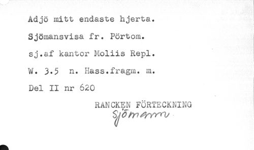 //// Adjö mitt endaste hjerta. //// J ! //// Sjömansvisa fr. Pörtom. //// sj.af kantor Noliis Repl. //// VJ. 3-5 R. Hass.fragm. m. //// i //// Del II nr 620 //// RANCKEN FÖRTECKNING ////