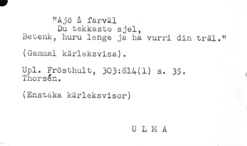//// "Ajö å farväl //// Du tekkaste sjel, //// Betenk, huru lenge ja ha vurri din träl." //// (Gammal kärleksvisa). //// Upl. Frösthult, 303:814(1) s. 35. //// Thorsen. //// (Enstaka kärleksvisor) //// U L M A ////