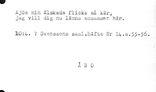 //// Ajös min älskade flicka så kär, //// jag vill dig nu lämna ensammen hår. //// ? Svenssons saml,häfte Nr 14.S.55-56. //// i* - //// ÅBO ////